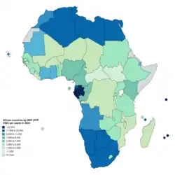 Improved stability and economic reforms have led to a great increase in foreign investment into many African nations, mainly from China,[152] which further spurred economic growth. Between 2000 and 2014, annual GDP growth in sub-Saharan Africa averaged 5.02%, doubling its total GDP from $811 billion to $1.63 trillion (constant 2015 USD).[153] North Africa experienced comparable growth rates.[154] A significant part of this growth can also be attributed to the facilitated diffusion of information technologies and specifically the mobile telephone.[155] While several individual countries have maintained high growth rates, since 2014 overall growth has considerably slowed, primarily as a result of falling commodity prices, continued lack of industrialisation, and epidemics of Ebola and COVID-19.[156][157]