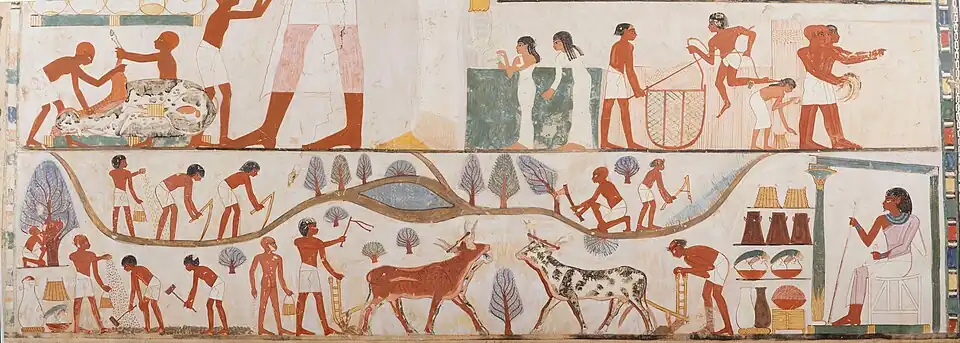 Egyptian society was highly stratified, and social status was expressly displayed. Farmers made up the bulk of the population, but agricultural produce was owned directly by the state, temple, or noble family that owned the land.[76] Farmers were also subject to a labor tax and were required to work on irrigation or construction projects in a corvée system.[77] Artists and craftsmen were of higher status than farmers, but they were also under state control, working in the shops attached to the temples and paid directly from the state treasury. Scribes and officials formed the upper class in ancient Egypt, known as the "white kilt class" in reference to the bleached linen garments that served as a mark of their rank.[78] The upper class prominently displayed their social status in art and literature. Below the nobility were the priests, physicians, and engineers with specialized training in their field. It is unclear whether slavery as understood today existed in ancient Egypt; there is difference of opinions among authors.[79]