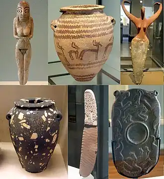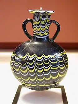 The Naqada culture manufactured a diverse selection of material goods, reflective of the increasing power and wealth of the elite, as well as societal personal-use items, which included combs, small statuary, painted pottery, high quality decorative stone vases, cosmetic palettes, and jewelry made of gold, lapis, and ivory. They also developed a ceramic glaze known as faience, which was used well into the Roman Period to decorate cups, amulets, and figurines.[18][19] During the last predynastic phase, the Naqada culture began using written symbols that eventually were developed into a full system of hieroglyphs for writing the ancient Egyptian language.[20]