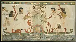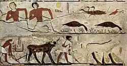 The Egyptians believed that a balanced relationship between people and animals was an essential element of the cosmic order; thus humans, animals and plants were believed to be members of a single whole.[89] Animals, both domesticated and wild, were therefore a critical source of spirituality, companionship, and sustenance to the ancient Egyptians. Cattle were the most important livestock; the administration collected taxes on livestock in regular censuses, and the size of a herd reflected the prestige and importance of the estate or temple that owned them. In addition to cattle, the ancient Egyptians kept sheep, goats, and pigs. Poultry, such as ducks, geese, and pigeons, were captured in nets and bred on farms, where they were force-fed with dough to fatten them.[90] The Nile provided a plentiful source of fish. Bees were also domesticated from at least the Old Kingdom, and provided both honey and wax.[91]