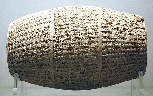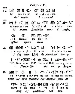 In Ancient Mesopotamia, a foundation deposit of the Akkadian Empire ruler Naram-Sin (ruled c. 2200 BC) was discovered and analysed by king Nabonidus, c. 550 BC, who is thus known as the first archaeologist.[12][13][14] Not only did he lead the first excavations which were to find the foundation deposits of the temples of Šamaš the sun god, the warrior goddess Anunitu (both located in Sippar), and the sanctuary that Naram-Sin built to the moon god, located in Harran, but he also had them restored to their former glory.[12] He was also the first to date an archaeological artifact in his attempt to date Naram-Sin's temple during his search for it.[15] Even though his estimate was inaccurate by about 1,500 years, it was still a very good one considering the lack of accurate dating technology at the time.[12][15][13]