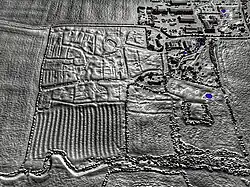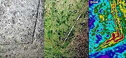 Aerial survey is conducted using cameras attached to airplanes, balloons, UAVs, or even Kites.[78] A bird's-eye view is useful for quick mapping of large or complex sites. Aerial photographs are used to document the status of the archaeological dig. Aerial imaging can also detect many things not visible from the surface. Plants growing above a buried human-made structure, such as a stone wall, will develop more slowly, while those above other types of features (such as middens) may develop more rapidly. Photographs of ripening grain, which changes colour rapidly at maturation, have revealed buried structures with great precision. Aerial photographs taken at different times of day will help show the outlines of structures by changes in shadows. Aerial survey also employs ultraviolet, infrared, ground-penetrating radar wavelengths, Lidar and thermography.[79]