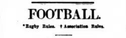 These ongoing efforts contributed to the formation of the Football Association (the FA) in 1863, which first met on the morning of 26 October 1863 at the Freemasons' Tavern in Great Queen Street, London.[42] The only school to be represented on this occasion was Charterhouse. The Freemasons' Tavern was the setting for five more meetings of the FA between October and December 1863; the English FA eventually issued the first comprehensive set of rules named Laws of the Game, forming modern football.[8] The laws included bans on running with the ball in hand and hacking (kicking an opponent in the shins), tripping and holding.[43] Eleven clubs, under the charge of FA secretary Ebenezer Cobb Morley, ratified the original thirteen laws of the game.[42] The sticking point was hacking, which a twelfth club at the meeting, Blackheath FC, had wanted to keep, resulting in their withdrawal from the FA.[42] Other English rugby clubs followed this lead and did not join the FA, and instead in 1871, along with Blackheath, formed the Rugby Football Union. The 1863 FA rules included handling of the ball by "marks" and the lack of a crossbar, making the game remarkably similar to Victorian rules football, which was being developed around the same time in Australia. The Sheffield FA played by its own rules until the 1870s, with the FA absorbing some of its rules until there was little difference between the games.[44]