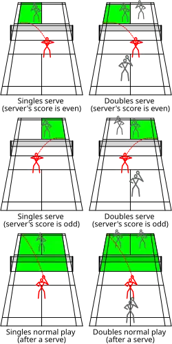 In singles, the server stands in their right service court when their score is even, and in their left service court when their score is odd.