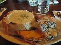 A bread bowl is a round loaf of bread which has had the top cut off and a large portion of the middle hollowed out to create an edible bowl.[1] They are often made out of sourdough bread or pumpernickel.[1] They are typically larger than a roll but smaller than a full-sized loaf of bread.