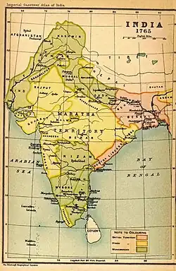 In the East Indies, British and Dutch merchants continued to compete in spices and textiles. With textiles becoming the larger trade, by 1720, in terms of sales, the British company had overtaken the Dutch.[53] During the middle decades of the 18th century, there were several outbreaks of military conflict on the Indian subcontinent, as the English East India Company and its French counterpart, struggled alongside local rulers to fill the vacuum that had been left by the decline of the Mughal Empire. The Battle of Plassey in 1757, in which the British defeated the Nawab of Bengal and his French allies, left the British East India Company in control of Bengal and as a major military and political power in India.[64] France was left control of its enclaves but with military restrictions and an obligation to support British client states, ending French hopes of controlling India.[65] In the following decades the British East India Company gradually increased the size of the territories under its control, either ruling directly or via local rulers under the threat of force from the Presidency Armies, the vast majority of which was composed of Indian sepoys, led by British officers.[66] The British and French struggles in India became but one theatre of the global Seven Years' War (1756–1763) involving France, Britain, and the other major European powers.[42]