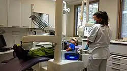 Dental treatments are carried out by a dental team, which often consists of a dentist and dental auxiliaries (such as dental assistants, dental hygienists, dental technicians, and dental therapists). Most dentists either work in private practices (primary care), dental hospitals, or (secondary care) institutions (prisons, armed forces bases, etc.).