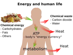 The basal metabolism rate measures the food energy expenditure per unit time by endothermic animals at rest.[47] In other words it is the energy required by body organs to perform normally. For humans, metabolic equivalent of task (MET) compares the energy expenditure per unit mass while performing a physical activity, relative to a baseline. By convention, this baseline is 3.5 mL of oxygen consumed per kg per minute, which is the energy consumed by a typical individual when sitting quietly.[48]