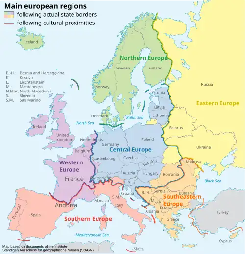 Clickable map of Europe, showing one of the most commonly used continental boundaries[u]