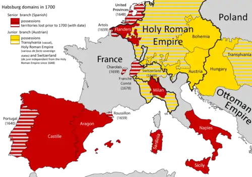 The Church's power was further weakened by the Reformation, which began in 1517 when German theologian Martin Luther nailed his Ninety-five Theses criticising the selling of indulgences to the church door. He was subsequently excommunicated in the papal bull Exsurge Domine in 1520 and his followers were condemned in the 1521 Diet of Worms, which divided German princes between Protestant and Catholic faiths.[147] Religious fighting and warfare spread with Protestantism.[148] The plunder of the empires of the Americas allowed Spain to finance religious persecution in Europe for over a century.[149] The Thirty Years' War (1618–1648) crippled the Holy Roman Empire and devastated much of Germany, killing between 25 and 40 percent of its population.[150] In the aftermath of the Peace of Westphalia, France rose to predominance within Europe.[151] The defeat of the Ottoman Turks at the Battle of Vienna in 1683 marked the historic end of Ottoman expansion into Europe.[152]