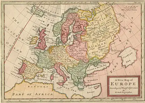 Four years later, in 1725, Philip Johan von Strahlenberg was the first to depart from the classical Don boundary. He drew a new line along the Volga, following the Volga north until the Samara Bend, along Obshchy Syrt (the drainage divide between the Volga and Ural Rivers), then north and east along the latter waterway to its source in the Ural Mountains. At this point he proposed that mountain ranges could be included as boundaries between continents as alternatives to nearby waterways. Accordingly, he drew the new boundary north along Ural Mountains rather than the nearby and parallel running Ob and Irtysh rivers.[40] This was endorsed by the Russian Empire and introduced the convention that would eventually become commonly accepted. However, this did not come without criticism. Voltaire, writing in 1760 about Peter the Great's efforts to make Russia more European, ignored the whole boundary question with his claim that neither Russia, Scandinavia, northern Germany, nor Poland were fully part of Europe.[35] Since then, many modern analytical geographers like Halford Mackinder have declared that they see little validity in the Ural Mountains as a boundary between continents.[41]