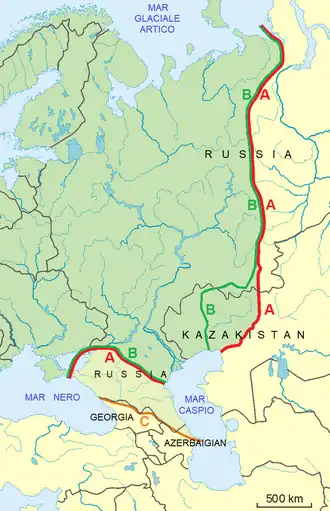 In Russia and the Soviet Union, the boundary along the Kuma–Manych Depression was the most commonly used as early as 1906.[45] In 1958, the Soviet Geographical Society formally recommended that the boundary between the Europe and Asia be drawn in textbooks from Baydaratskaya Bay, on the Kara Sea, along the eastern foot of Ural Mountains, then following the Ural River until the Mugodzhar Hills, and then the Emba River; and Kuma–Manych Depression,[46] thus placing the Caucasus entirely in Asia and the Urals entirely in Europe.[47] The Flora Europaea adopted a boundary along the Terek and Kuban rivers, so southwards from the Kuma and the Manych, but still with the Caucasus entirely in Asia.[48][49] However, most geographers in the Soviet Union favoured the boundary along the Caucasus crest,[50] and this became the common convention in the later 20th century, although the Kuma–Manych boundary remained in use in some 20th-century maps.