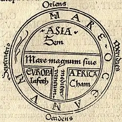 The first recorded usage of Eurṓpē as a geographic term is in the Homeric Hymn to Delian Apollo, in reference to the western shore of the Aegean Sea. As a name for a part of the known world, it is first used in the 6th century BCE by Anaximander and Hecataeus. Anaximander placed the boundary between Asia and Europe along the Phasis River (the modern Rioni River on the territory of Georgia) in the Caucasus, a convention still followed by Herodotus in the 5th century BCE.[28] Herodotus mentioned that the world had been divided by unknown persons into three parts—Europe, Asia, and Libya (Africa)—with the Nile and the Phasis forming their boundaries—though he also states that some considered the River Don, rather than the Phasis, as the boundary between Europe and Asia.[29] Europe's eastern frontier was defined in the 1st century by geographer Strabo at the River Don.[30] The Book of Jubilees described the continents as the lands given by Noah to his three sons; Europe was defined as stretching from the Pillars of Hercules at the Strait of Gibraltar, separating it from Northwest Africa, to the Don, separating it from Asia.[31]