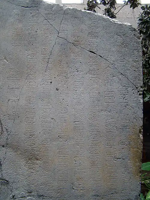 During the Middle Formative Period (c. 900 BCE – c. 300 BCE) of Pre-Columbian Mesoamerica, the Zapotec civilization, heavily influenced by the Olmec civilization, established the first known full writing system of the region (possibly predated by the Olmec Cascajal Block),[125] as well as the first known astronomical calendar in Mesoamerica.[126][127] Following a period of initial urban development in the Preclassical period, the Classic Maya civilization (c. 250 CE – c. 900 CE) built on the shared heritage of the Olmecs by developing the most sophisticated systems of writing, astronomy, calendrical science, and mathematics among Mesoamerican peoples.[126] The Maya developed a positional numeral system with a base of 20 that included the use of zero for constructing their calendars.[128][129] Maya writing, which was developed by 200 BCE, widespread by 100 BCE, and rooted in Olmec and Zapotec scripts, contains easily discernible calendar dates in the form of logographs representing numbers, coefficients, and calendar periods amounting to 20 days and even 20 years for tracking social, religious, political, and economic events in 360-day years.[130]