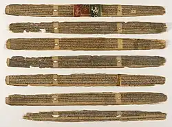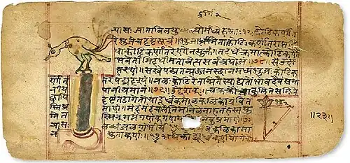 The Bakhshali manuscript contains problems involving arithmetic, algebra and geometry, including mensuration. The topics covered include fractions, square roots, arithmetic and geometric progressions, solutions of simple equations, simultaneous linear equations, quadratic equations and indeterminate equations of the second degree.[84] In the 3rd century BCE, Pingala presents the Pingala-sutras, the earliest known treatise on Sanskrit prosody.[85] He also presents a numerical system by adding one to the sum of place values.[86] Pingala's work also includes material related to the Fibonacci numbers, called mātrāmeru.[87]