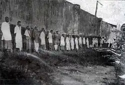 Maveeran Alagumuthu Kone was an early revolutionary against the British presence in Tamil Nadu. He became a military leader in the town of Ettayapuram and was defeated in battle against the British and Maruthanayagam's forces. He was executed in 1757.[9] Puli Thevar opposed the Nawab of Arcot, who was supported by the British.[10] Maruthanayagam Pillai was a commandant of the British East India Company's Madras Army. He was born in a Tamil Vellalar caste family in a village called Panaiyur in British India, what is now in Nainarkoil Taluk, Ramanathapuram District of Tamil Nadu, India. He converted to Islam and was named Muhammad Yusuf Khan. He was popularly known as Khan Sahib when he became the ruler of Madurai. He became a warrior in the Arcot troops, and later a commandant for the British East India Company troops. The British and the Arcot Nawab employed him to suppress the Polygar (a.k.a. Palayakkarar) uprising in South India. Later, he was entrusted to administer the Madurai country when the Madurai Nayak rule ended. He later fought a war against the British and the Arcot Nawab. A dispute arose with the British and the Arcot Nawab, and three of Khan's associates were bribed to capture him. He was captured during his morning prayer (Thozhugai) and hanged on 15 October 1764 at Sammatipuram near Madurai. Local legends state that he survived two earlier attempts at hanging, and that the Nawab feared Yusuf Khan would come back to life and so had his body dismembered and buried in different locations around Tamil Nadu. In Eastern India and across the country, Indigenous communities organised numerous uprising against the British and their fellow members, especially landlords and moneylenders.[11][12][13] One of the earliest of these on record was led by Binsu Manki around 1771 over the transfer of Jharkhand to the East India Company.[11] The Rangpur Dhing took place from 1782 to 1783 in nearby Rangpur, Bengal.[14] Following Binsu Manki's revolt in Jharkhand, numerous uprisings across the region took place, including the rebellion led by Tilka Manjhi in 1784; Bhumij Revolt of Manbhum from 1798 to 1799; the Chero Uprising of Palamu in 1800 under the leadership of Bhukan Singh, and two uprising of the Munda community in Tamar region, during 1807 led by Dukan Mank, and 1819–20 under the leadership Bundu and Konta.[11] The Ho Rebellion took place when the Ho community first came in contact with the British, from 1820 to 1821 near Chaibasa on the Roro River in West Singhbhum, but were defeated by the technologically enhanced colonial cavalry.[15][16] A larger Bhumij Revolt occurred near Midnapur in Bengal, under the leadership of Ganga Narain Singh who had previously also been involved in co-leading the Chuar Rebellions in these regions from 1771 to 1809.[17] Syed Mir Nisar Ali Titumir was an Islamic preacher who led a peasant uprising against the Hindu Zamindars of Bengal and the British during the 19th century. Along with his followers, he built a bamboo fort (Bansher Kella in Bengali) in Narkelberia Village, which gained a prominent place in Bengali folk legend. After the storming of the fort by British soldiers, Titumir died of his wounds on 19 November 1831.[18] These rebellions lead to larger regional movements in Jharkhand and beyond such as the Kol Insurrection led by Singhray and Binray Manki, where the Kol (Munda, Oraon, Bhumij and Ho communities) united to rebel against the "outsiders" from 1830 -1833.[11][12][15][19]