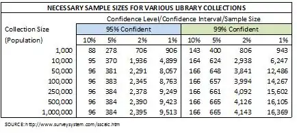 In the table below, for a tolerance of ±5%, the sample sizes for a collection of more than 50,000 books would be 381 items for 95% confidence, and 648 items for 99% confidence. To achieve a lower tolerance of ±1% one would have to sample thousands of books, which might stretch the resources available for even a sample inventory. Surveying 270 to 655 volumes is much more reasonable for the average-sized library staff.