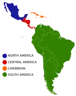 Latin America can be subdivided into several subregions based on geography, politics, democracy, demographics and culture. The basic geographical subregions are North America, Central America, the Caribbean and South America; the latter contains further politico-geographical subdivisions such as the Southern Cone, the Guianas and the Andean states. It may be subdivided on linguistic grounds into Spanish America and Portuguese America, and by some definitions, French America.[32]