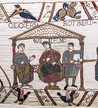 Chivalry and the ethos of courtly love developed in royal and noble courts. This culture was expressed in the vernacular languages rather than Latin and comprised poems, stories, legends, and popular songs spread by troubadours or Minnesängers, or wandering minstrels. Often the stories were written down in the chansons de geste, or "songs of great deeds", such as The Song of Roland or The Song of Hildebrand.[228] Secular and religious histories were also produced.[229] Geoffrey of Monmouth (d. c. 1155) composed his Historia Regum Britanniae, a collection of stories and legends about Arthur.[230] Other works were more clearly history, such as Otto von Freising's (d. 1158) Gesta Friderici Imperatoris detailing the deeds of Emperor Frederick Barbarossa, or William of Malmesbury's (d. c. 1143) Gesta Regum on the kings of England.[229]