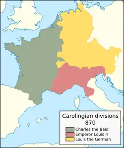 A three-year civil war followed his death. By the Treaty of Verdun (843), a kingdom between the Rhine and Rhone rivers was created for Lothair to go with his lands in Italy, and his imperial title was recognised. Louis the German controlled Bavaria and the eastern lands in modern-day Germany. Charles the Bald received the western Frankish lands, comprising most of modern-day France.[114] Charlemagne's grandsons and great-grandsons divided their kingdoms between their descendants, eventually causing all internal cohesion to be lost.[115][M] In 987, the Carolingian dynasty was replaced in the western lands, with the crowning of Hugh Capet (r. 987–996) as king.[N][O] In the eastern lands, the dynasty had died out earlier, in 911, with the death of Louis the Child,[118] and the selection of the unrelated Conrad I (r. 911–918) as king.[119]