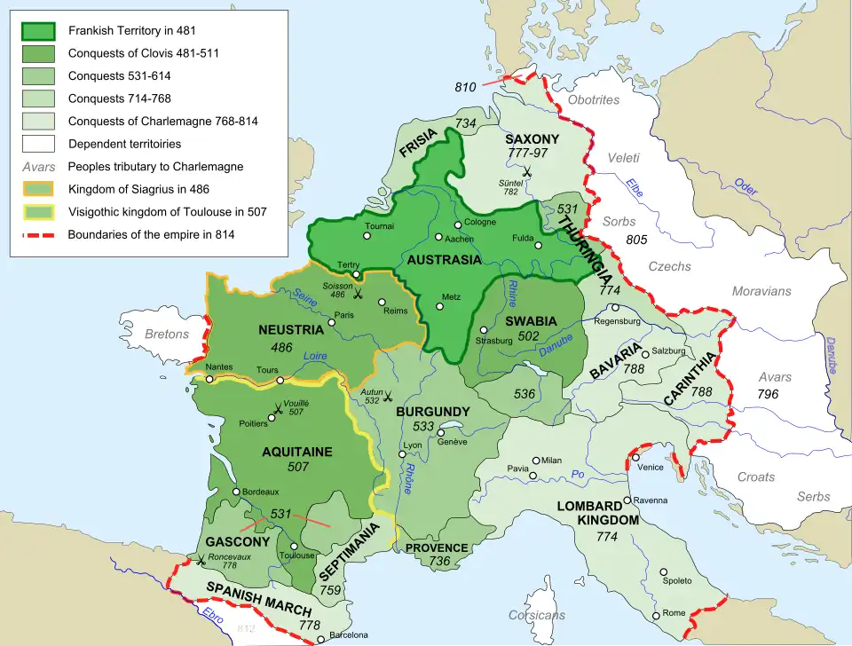 The Carolingian dynasty, as the successors to Charles Martel are known, officially took control of the kingdoms of Austrasia and Neustria in a coup of 753 led by Pippin III (r. 752–768). A contemporary chronicle claims that Pippin sought and gained authority for this coup from Pope Stephen II (pope 752–757). Pippin's takeover was reinforced with propaganda that portrayed the Merovingians as inept or cruel rulers, exalted the accomplishments of Charles Martel, and circulated stories of the family's great piety. At the time of his death in 768, Pippin left his kingdom in the hands of his two sons, Charles (r. 768–814) and Carloman (r. 768–771). When Carloman died of natural causes, Charles blocked the succession of Carloman's young son and installed himself as the king of the united Austrasia and Neustria. Charles, more often known as Charles the Great or Charlemagne, embarked upon a programme of systematic expansion in 774 that unified a large portion of Europe, eventually controlling modern-day France, northern Italy, and Saxony. In the wars that lasted beyond 800, he rewarded allies with war booty and command over parcels of land.[103] In 774, Charlemagne conquered the Lombards, which freed the papacy from the fear of Lombard conquest and marked the beginnings of the Papal States.[104][J]