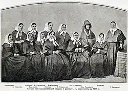 During the Crimean War, Grand Duchess Elena Pavlovna called for women to join the Order of Exaltation of the Cross (Krestodvizhenskaya Obshchina) for a year of service in military hospitals. The first section of twenty-eight "sisters", headed by Aleksandra Petrovna Stakhovich, the Directress of the Order, reached Crimea early in November 1854.[20]