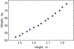 An important consideration when carrying out statistical inference using regression models is how the data were sampled. In this example, the data are averages rather than measurements on individual women. The fit of the model is very good, but this does not imply that the weight of an individual woman can be predicted with high accuracy based only on her height.