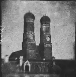 In March 1837,[40] Franz von Kobell, used silver chloride and a cardboard camera to make pictures in negative of the Frauenkirche and other buildings in Munich, then taking another picture of the negative to get a positive, the actual black and white reproduction of a view on the object. In 1839, Kobell, together with Carl August von Steinheil, reported on their experiments to the Bavarian Academy of Sciences. The pictures produced were round with a diameter of 4 cm, the method was later named the "Steinheil method".