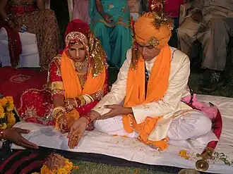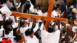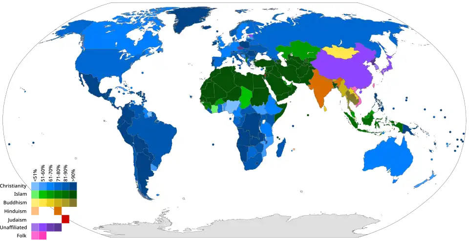 There are an estimated 10,000 distinct religions worldwide,[11] though nearly all of them have regionally based, relatively small followings. Four religions—Christianity, Islam, Hinduism, and Buddhism—account for over 77% of the world's population, and 92% of the world either follows one of those four religions or identifies as nonreligious,[12] meaning that the vast majority of remaining religions account for only 8% of the population combined. The religiously unaffiliated demographic includes those who do not identify with any particular religion, atheists, and agnostics, although many in the demographic still have various religious beliefs.[13] Many world religions are also organized religions, most definitively including the Abrahamic religions Christianity, Islam, Judaism, and the Baháʼí Faith, while others are arguably less so, in particular folk religions, indigenous religions, and some Eastern religions. A portion of the world's population are members of new religious movements.[14] Scholars have indicated that global religiosity may be increasing due to religious countries having generally higher birth rates.[15]