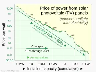 Swanson's law–stating that solar module prices have dropped about 20% for each doubling of installed capacity—defines the "learning rate" of solar photovoltaics.[68][69]