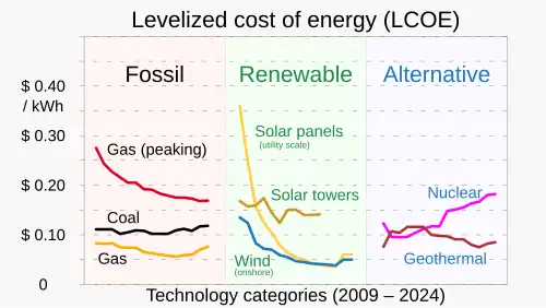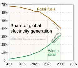 Renewable energy systems have rapidly become more efficient and cheaper over the past 30 years.[3] A large majority of worldwide newly installed worldwide electricity capacity is now renewable.[4] Renewable energy sources, such as solar and wind power, have seen significant cost reductions over the past decade, making them more competitive with traditional fossil fuels.[5] In some geographic localities, photovoltaic solar or onshore wind is the cheapest new-build electricity.[6] From 2011 to 2021, renewable energy grew from 20% to 28% of the global electricity supply. Power from the sun and wind accounted for most of this increase, growing from a combined 2% to 10%. Use of fossil energy shrank from 68% to 62%.[7] In 2024, renewables accounted for over 30% of global electricity generation and are projected to reach over 45% by 2030.[8][9] Many countries already have renewables contributing more than 20% of their total energy supply, with some generating over half or even all their electricity from renewable sources.[10][11]