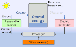 Electrical energy storage is a collection of methods used to store electrical energy. Electrical energy is stored during times when production (especially from intermittent sources such as wind power, tidal power, solar power) exceeds consumption, and returned to the grid when production falls below consumption. Pumped-storage hydroelectricity accounts for more than 85% of all grid power storage.[42] Batteries are increasingly being deployed for storage[43] and grid ancillary services[44] and for domestic storage.[45] Green hydrogen is a more economical means of long-term renewable energy storage, in terms of capital expenditures compared to pumped hydroelectric or batteries.[46][47]