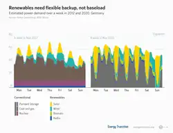 Estimated power demand over a week in May 2012 and May 2020, Germany, showing the variability in solar and wind power both day-to-day and month-to-month