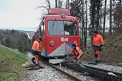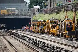 Simple repairs may be done while a train is parked on the tracks, but more extensive repairs will be done at a motive power depot.[45] Similar facilities exist for repairing damaged or defective train cars.[46] Maintenance of way trains are used to build and repair railroad tracks and other equipment.[47]
