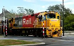 Diesel locomotives pulling a freight train in New Zealand