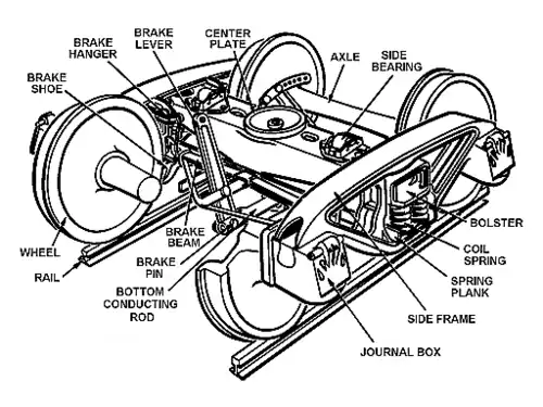 Bogies, also known in North America as trucks, support the wheels and axles of trains. Trucks range from just one axle to as many as four or more. Two-axle bogies are the most common worldwide, as they decrease the impact of track irregularities, improve curve negotiation, and distribute heavy loads more effectively than single-axle bogies.[35]
