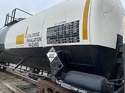 Trains carrying hazardous materials display information identifying their cargo and hazards. This tank car carrying chlorine displays, among other markings, a U.S. DOT placard showing a UN number that identifies the hazardous substance.[52]